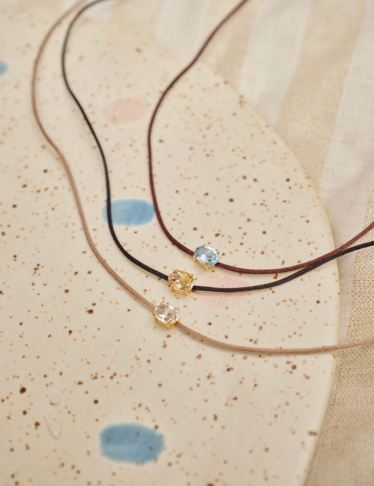 Colar feito com fio de seda dourado, com pingente oval de Cristal