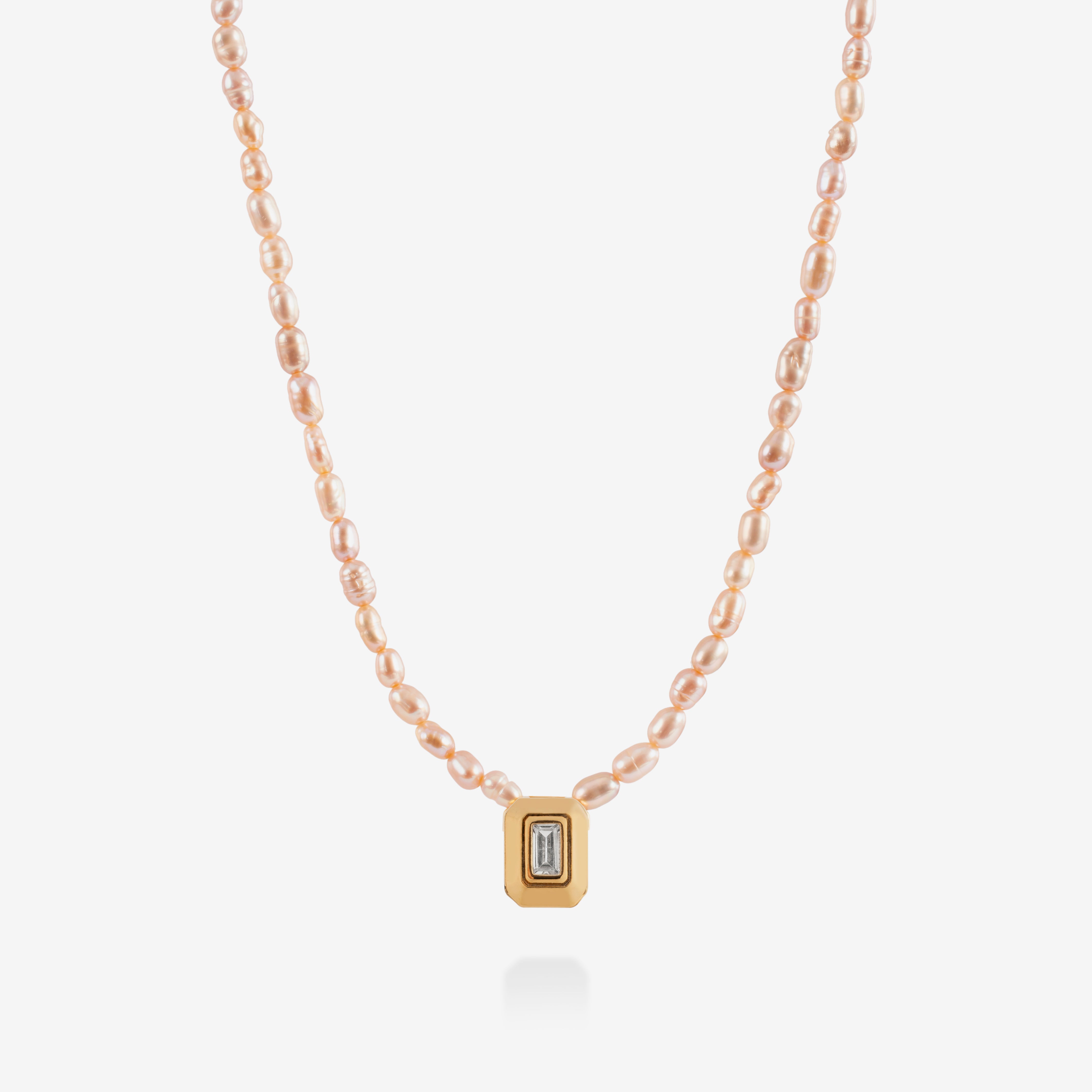 Pular para o conteúdoColar feito com Pérolas naturais blush e pingente em ouro 18k com uma Safira branca no meio.