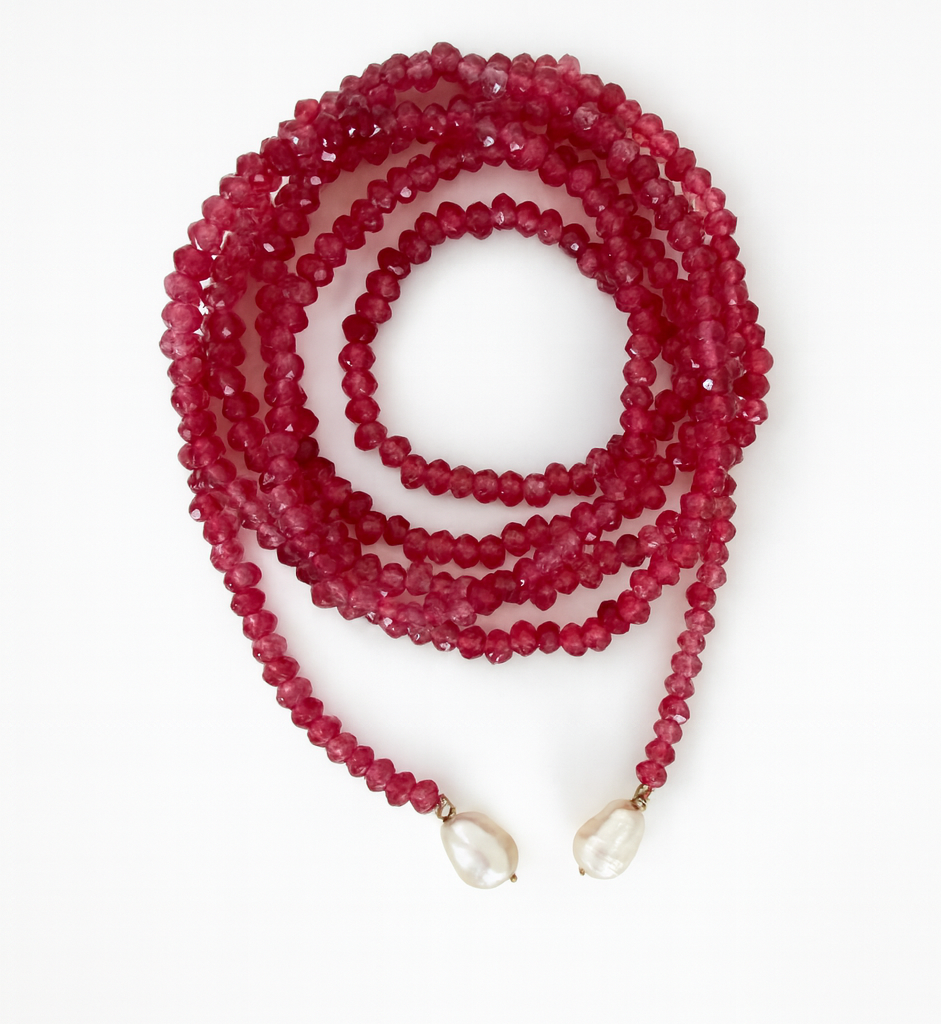 Colar longo e versátil, feito em jade com pontas finalizadas em pérolas naturais e acabamentos em ouro 18k.